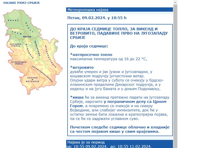 - Do kraja nedelje biće veoma toplo, za vikend kiša i pljuskovi, posebno na jugu regiona. Od nedelje češća pojava kiše uz neznatno zahlađenje. Drugi deo nedelje donosi suvo vreme uz moguće prolazno pogoršanje oko 17. februara, ali nema signala za bilo kakvo konkretnije zahlađenje barem u narednih desetak dana", prognoza je meteorologa amatera Marka Čubrila, koji napominje i da su "svi izneti podaci i procene rezultat njegove obrade i tumačenja numeričkih modela, a za zvanične informacije treba pratiti državne prognostičke zavode".