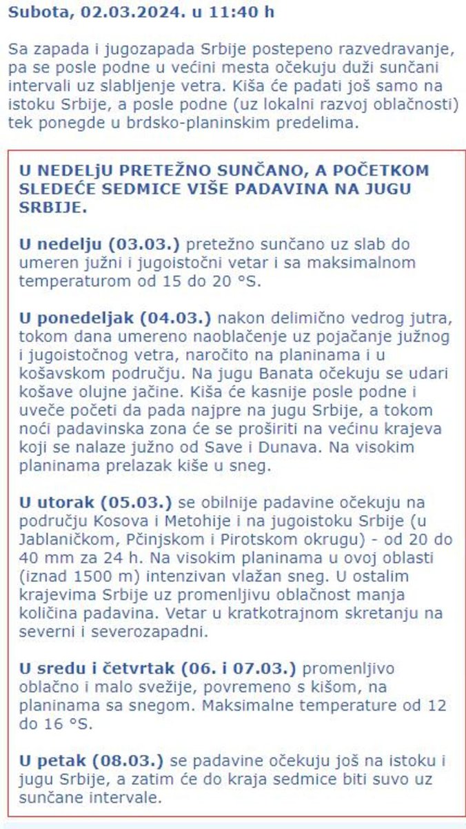 U nedelju pretežno sunčano, a početkom sledeće sedmice više padavina na jugu Srbije
