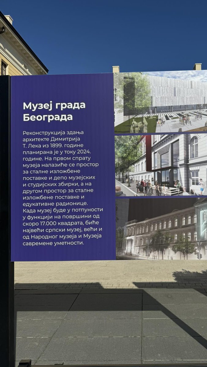 „To će biti jedna od najlepših fasada u našem gradu, ali nije fasada zbog fasade važna, utoj zgradi će biti Dečji muzej. Prvi put imaćemo Dečji muzej, po ugledu na ZOOM muzej uBeču, koji treba da bude inkubator da od naše dece stvori buduće ljubitelje i poslanikekulture, buduće umetnike i kulturne radnike“, dodao je Selaković i najavio je da će u okvirutog muzeja biti i dve pozorišne scene, kao i da će Muzej grada Beograda napokon imati svojdom i da će po kvadraturi biti najveći muzej u Srbiji.