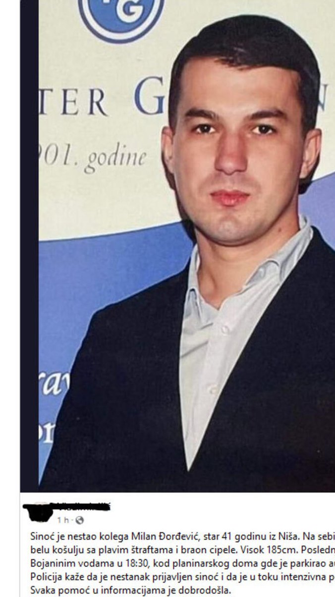 - Sinoć je nestao kolega Milan Đorđević, star 41 godinu iz Niša. Na sebi je imao teget pantalone, belu košulju sa plavim štraftama i braon cipele. Visok 185cm. Poslednji put viđen sinoć na Bojaninim vodama u 18:30, kod planinarskog doma gde je parkirao auto - Škodu. Svaka pomoć u informacijama je dobrodošla - navodi se u apelima za pomoć.