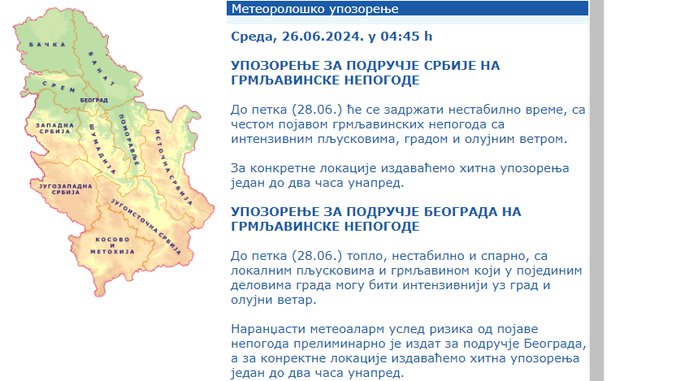 Dalje RHMZ upozorava da će se do petka zadržati nestabilno vreme, sa čestom pojavom grmlјavinskih nepogoda sa intenzivnim plјuskovima, gradom i olujnim vetrom. "Za konkretne lokacije izdavaćemo hitna upozorenja jedan do dva časa unapred", stoji u upozorenju.