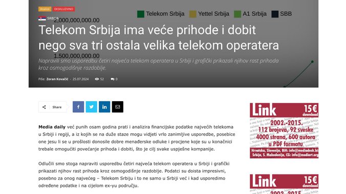 “Pojedini glasni kritičari često naglašavaju da je Telekom Srbija državna kompanija i da je zbog toga u povlašćenom položaju, no nama je na ovim prostorima poznatiji pojam državnih kompanija kao onih koje su loše vođene, koje ne napreduju i koje se ne šire u regionu, što je zasigurno čista suprotnost onog što radi Telekom Srbija. Kao dobri hroničari zbivanja na telekom tržištu regije možemo navesti da imamo baš takve lošije primere državnih telekom kompanija u Sloveniji (Telekom Slovenije) i Bosni i Hercegovini (BH Telecom) čiji prihodi stagniraju, nisu dobro vođene, te nemaju strategiju širenja. Telekom Slovenije je imao prihode u 2016. godini od 677 miliona evra, a u 2023. samo 611 miliona. BH Telecom je u 2016. prihodovao 279 miliona evra, a prošle godine 271 milion. Više je nego jasno što je od tog dvoje bolje!”, zaključuje se u analizi hrvatskog ekspertskog portala Medija dejli.