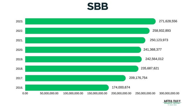 “Najmanje ukupne prihode, od četiri velika operatera, ima SBB u vlasništvu Junajted Grupe, koji su u 2023. godini iznosili malo više od 271 miliona evra. Njihov rast prihoda kroz osmogodišnje razdoblje je bio 56 odsto. Neto dobit SBB je u 2023. godini iznosila nešto više od 32 miliona evra i gotovo je jednaka u poslednjih nekoliko godina”, ističe se u analizi Medija dejli.