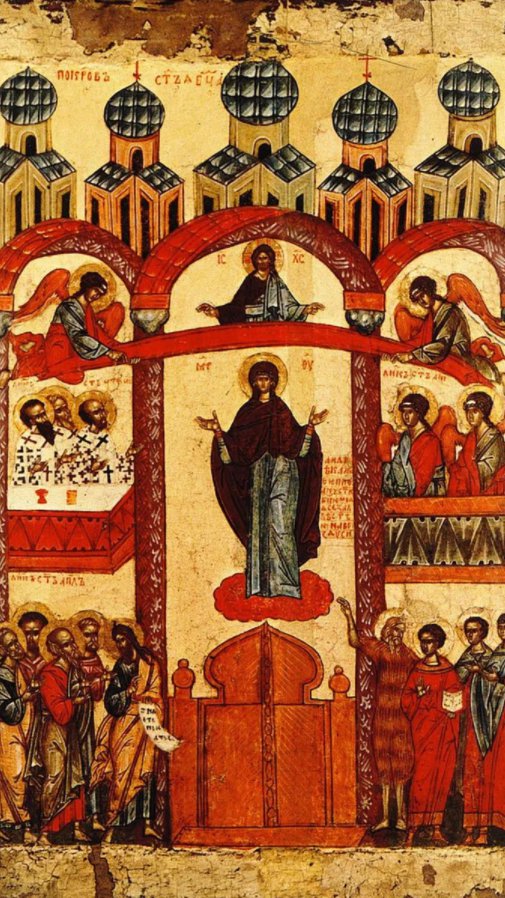 Prema predanju, tokom svenoćno bdenja u Bogorodičinoj crkvi Vlaherne u Carigradu, kojoj je prisustvovao i Sveti Andrej Jurodivi sa svojim učenikom, Andrej je ugledao Presvetu Bogorodicu sa rasprostrtim omoforom iznad ljudi u crkvi. Kako je zapisano, Bogorodica je tom odećom pokrivala narod.