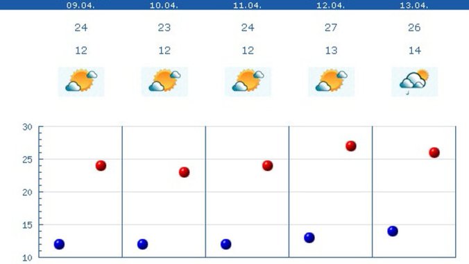 Prema izgledima vremena do 16. aprila, u utorak će preovlađivati sunčano, samo ujutru na severu i istoku uz vise oblacnosti ponegde kratkotrajna kisa. U sredu i četvrtak ujutro kratkotrajna magla, tokom dana pretežno sunčano. U sredu posle podne na istoku uz lokalni razvoj oblačnosti kratkotrajna kiša. Do kraja perioda pretežno sunčano, posle podne uz lokalni razvoj oblačnosti moguća pojava kratkotrajnog pljuska.