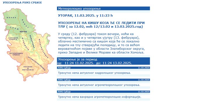 Ipak, narandžasto upozorenje zbog ekstremno niskih temperatura važiće u jugoistočnoj i istočnoj Srbiji, što znači da je vreme opasno.