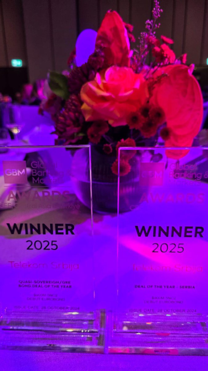 Telekom Srbija osvojio je dve velike nagrade na prestižnoj međunarodnoj poslovnoj konferenciji u Istanbulu, a obe se odnose na istorijski posao izdavanja evroobveznica od 900 miliona dolara na berzi u Dablinu.