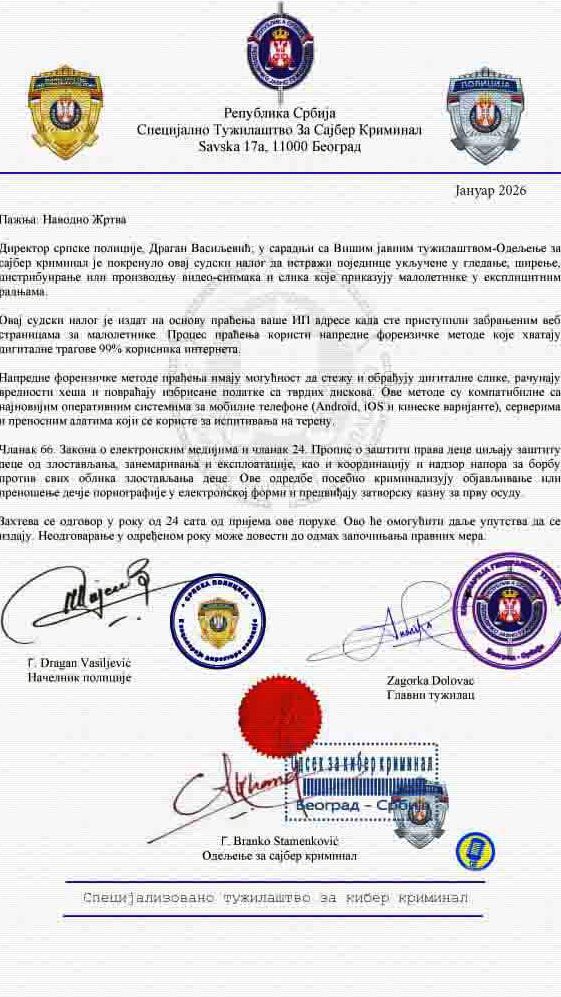 Ministarstvo unutrašnjih poslova posebno ističe da državni organi Republike Srbije ne komuniciraju sa građanima na opisani način, niti putem neformalnih elektronskih poruka zahtevaju hitno izjašnjavanje, dostavljanje podataka, niti prete sankcijama.