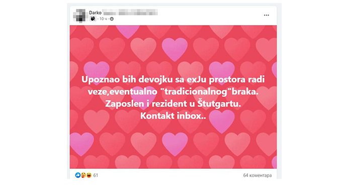 - Upoznao bih devojku sa ex Yu prostora radi veze, a eventualno i radi "tradicionalnog" braka. Zaposlen i rezident u Štutgartu - napisao je Darko u jednoj grupi koja okuplja naše građane u Nemačkoj.