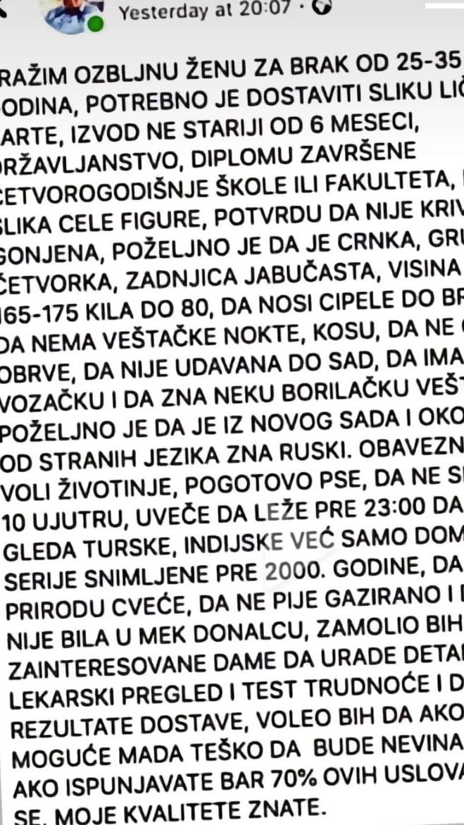 - Zamolio bih zainteresovane dame da urade detaljan lekarski pregled i test trudnoće i da mi rezultate dostave, voleo bih ako je moguće da bude nevina, što je teško. Dame, ako ispunjavate 70% ovih uslova, javite se, moje kvalitete znate - napisao je Jovica.