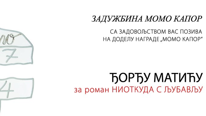 Dobitnik ovogodišnje nagrade „Momo Kapor“ za književnost je Đorđe Matić za roman Niotkuda s ljubavlju, a odluku o tome jednoglasno je doneo eminentni žiri u sastavu Muharem Bazdulj, književnik (predsednik), Radmila Stanković, novinarka i Vule Žurić, književnik.