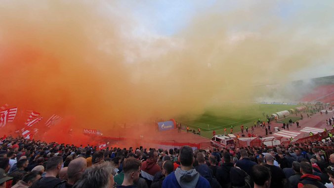 Ni ovog puta nije moglo da prođe bez incidenta, pa su navijači sa tribina bacali šta su stigli, a u "kanalu" ispod južne tribine došlo je i do požara.