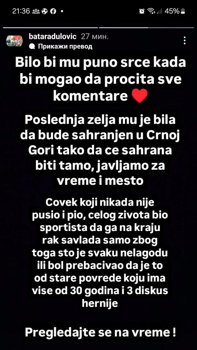 "Čovek koji nikada nije pušio i pio, celog života bio sportista, da ga na kraju rak savlada samo zbog toga što je svaku nelagodu ili bol prebacivao da je to od stae povrede koju ima više od 30 godina i tri diskus hernije...