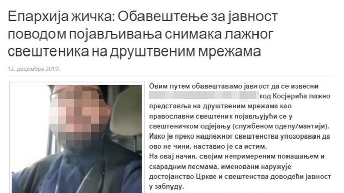 - Obaveštavamo javnost da se izvesni O. J.iz sela kod Kosjerića lažno predstavlja na društvenim mrežama kao pravoslavni sveštenik pojavljujući se u svešteničkom odjejanju (službenom odelu/mantiji). On je svojim neprimerenim ponašanjem i skaradnim pesmama, imenovani naružuje dostojanstvo Crkve i sveštenstva dovodeći javnost u zabludu. Naglašavamo da nije reč o pravoslavnom svešteniku, već o licu koje se lažno predstavlja kao sveštenik. Zbog toga će protiv njega biti preduzete pravne i kanonske mere - naglasili su iz Eparhije.