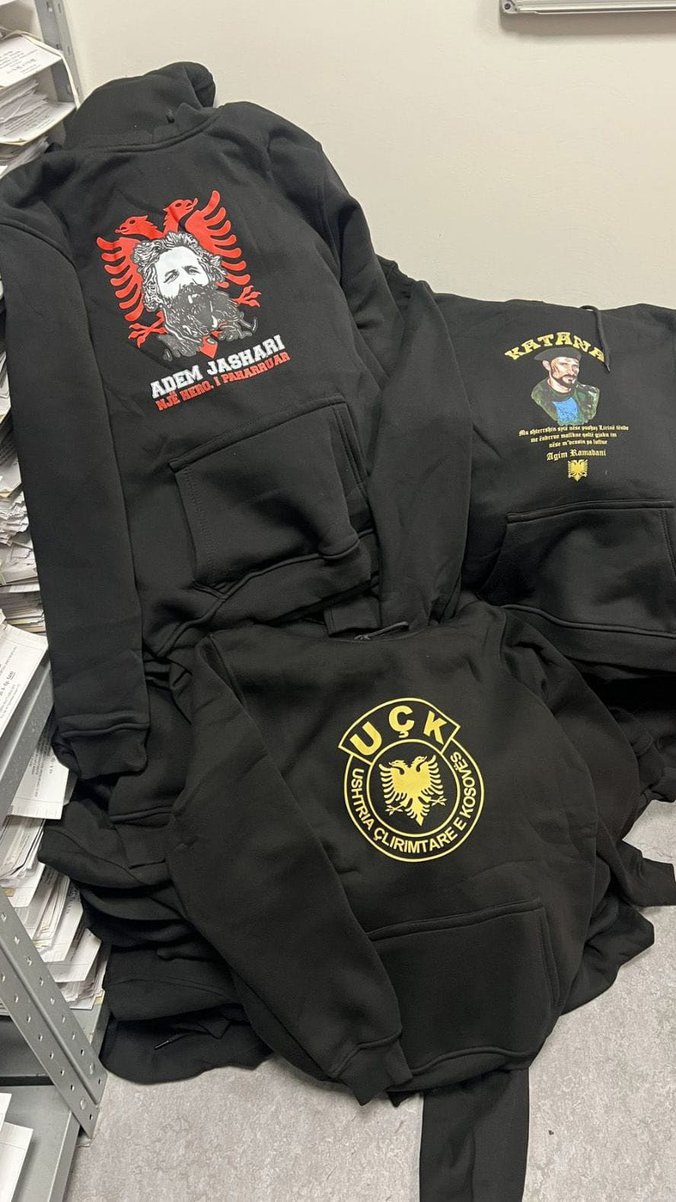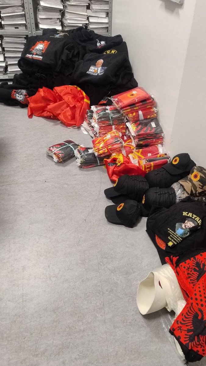 Policija je na administrativnom prelazu Merdare pregledom kombija marke „mercedes“, kojim je iz pravca AP KiM upravljao osumnjičeni, pronašla pet torbi u kojima su se nalazile 22 majice, 244 zastave i 86 kačketa sa natpisom UČK, 65 dukserica sa likom Agima Ramadanija, 58 šalova sa grbom Albanije, kao i 92 kape „ćelepoši“.