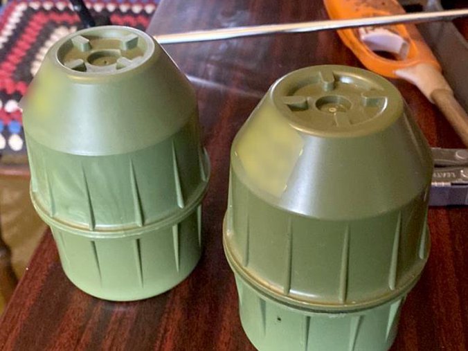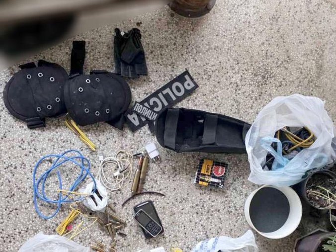 Oduzete su dve ručne bombe, dve kutije za ručne bombe, mačeta, pet pištoljskih okvira, više od 200 komada pištoljske i puščane municije različitog kalibra, deset čaura, elektronske kapisle, dva mobilna telefona, tri policijske oznake, službena legitimacija MUP-a, dva para lisica, gas maska, beretka sa srpskim grbom i više komada vojne garderobe.