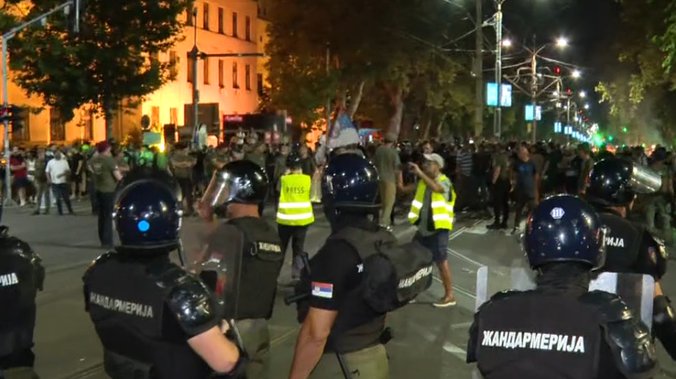 Za to vreme nepoznati učesnici javnog skupa su prilazili, negodovali, bacali flaše, polivali vodom policijіske službenike, koji su preduzimali službenu radnu lišenja slobode okrivljenog.