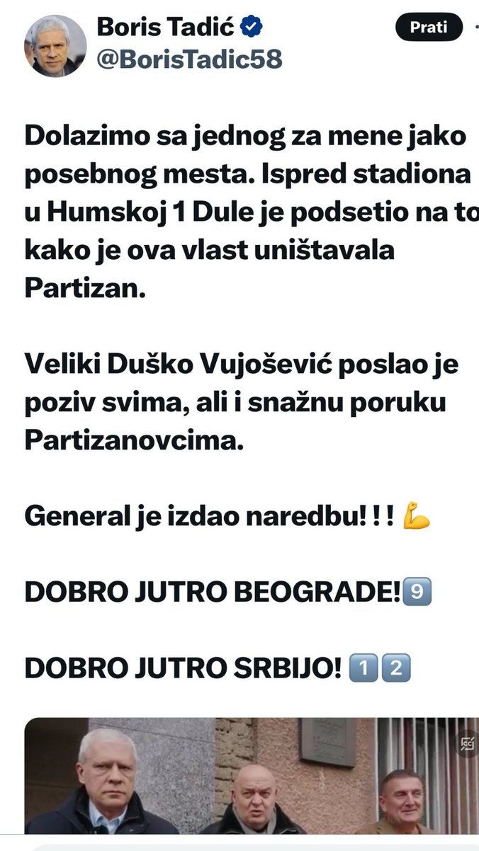 Nekadašnji predsednik Boris Tadić otišao je sa Vujoševićem u Humsku 1 i obratio se navijačima rečima da je: General izdao naredbu.