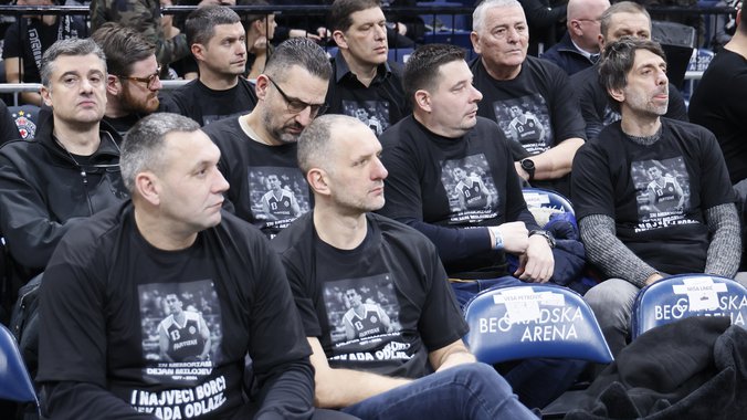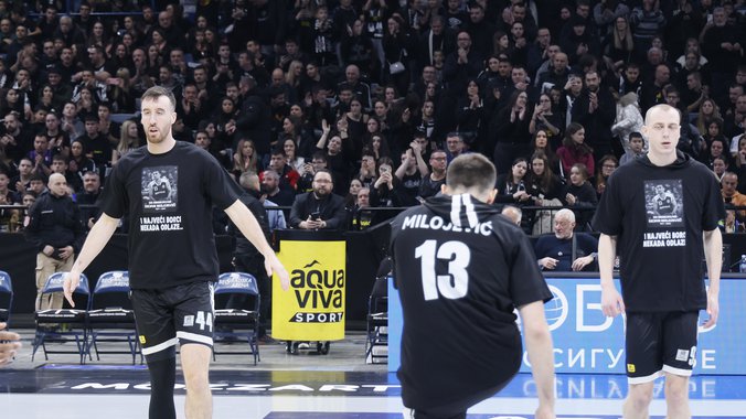 Košarkaši Mege izašli su na meča sa Partizanom u posebnim majicima sa lekom Dejana Milojevića.
