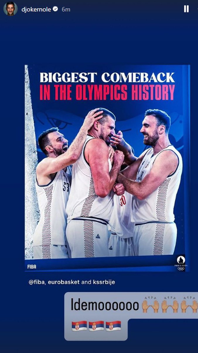 Naime, on je podelio FIBA fotografiju i naslov "najveći povaratk u istoriji", aludirajuči na preokret protiv Australije, te je uz nju Nole napisao "Idemoooooo".