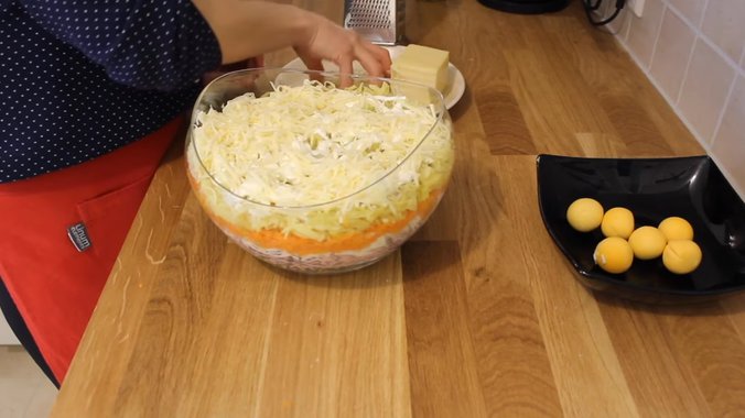 Sledeće idu jaja pomešana sa krastavcima, opet preliti, pa sve posuti rendanim sirom i mrvljenim žumancima.