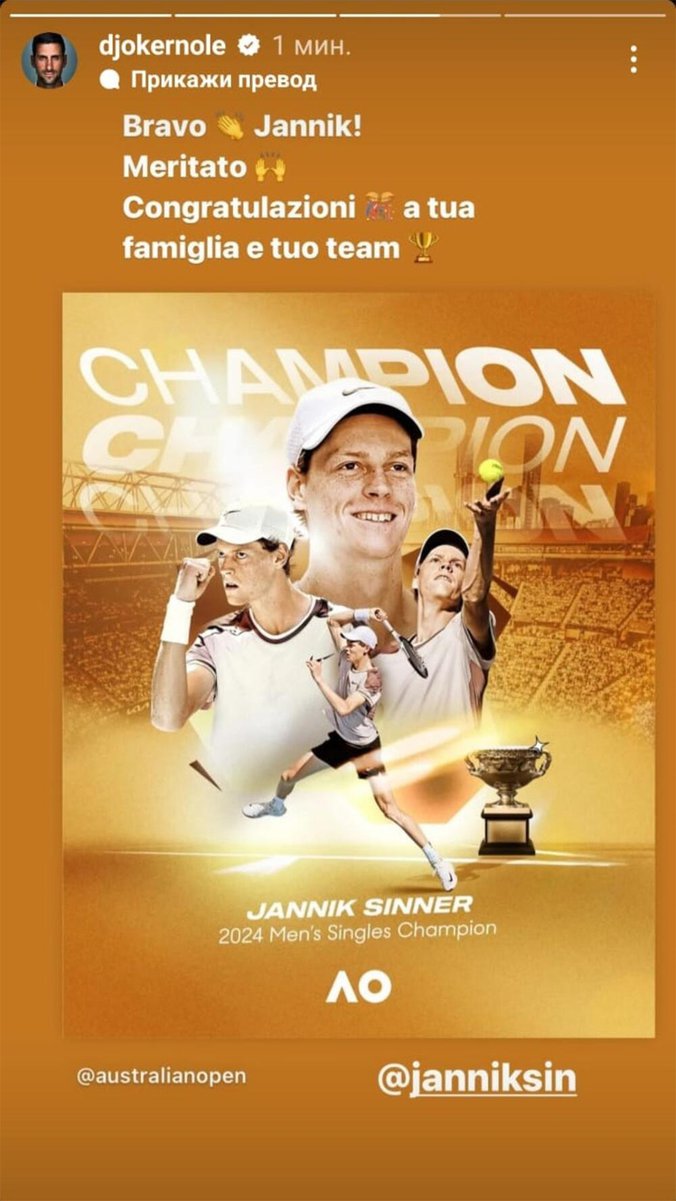 Najbolji teniser sveta, Novak Đoković, oglasio se nekoliko minuta nakon što je završeno finale Australijan opena. Novak je praktično među prvima čestitao titulu fantastičnom Janiku Sineru koji mu nije ostavio nikakve šanse u polufinalnom okršaju.