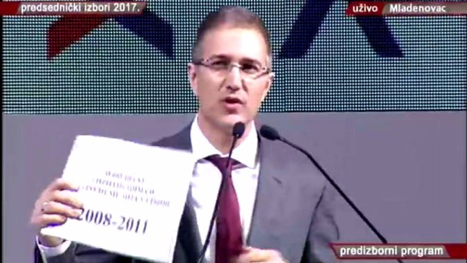 Stefanović je poručio da građani ne smeju dozvoliti da "dosovski i kvazidosovski" kandidati vrate državu u prošlost. Stefanović je na predizbornom mitingu u Mladenovcu pokazao izveštaj Verice Barać o kontroli medija u Srbiji od 2008. do 2011. i istakao da je siguran da u vreme prethodne vlasti niko nije mogao da pročita "ni slovo" tog izveštaja.