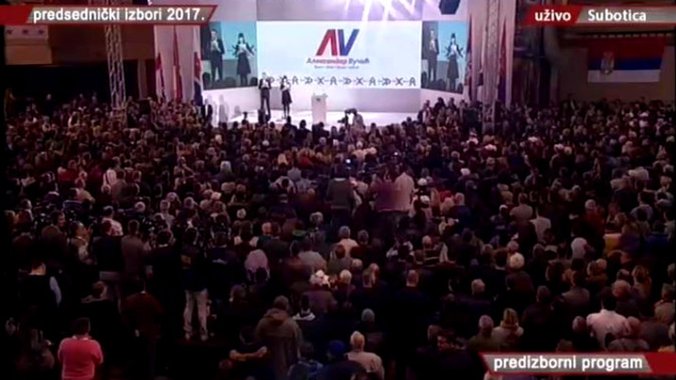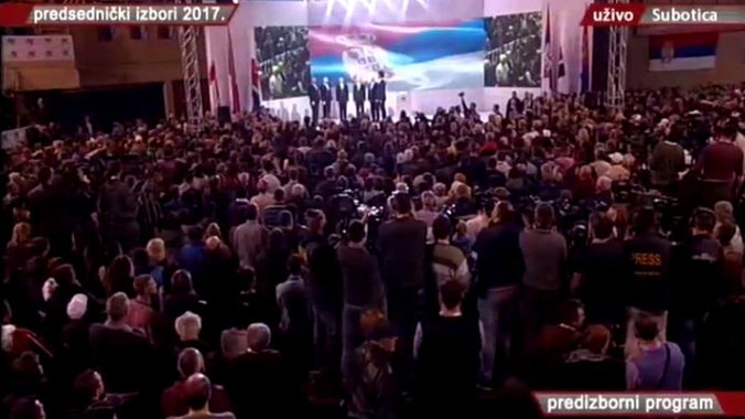 17.00 - Zbog velikog interesovanja simpatizera SNS da prisustvuju mitingu i u Subotici su neki od njih morali da ostanu ispred sportske hale. S tribina se vijore zastave Srbije i zastave SNS i koalicionih partnera.Spremni su i baloni u bojama srpske zastave koji ce biti pušteni. Okupljeni skandiraju "Srbija".