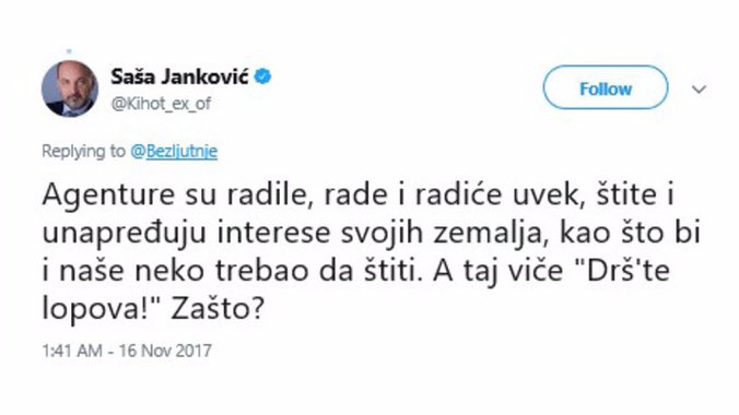 Ni ovo mu nije bilo dovoljno, pa je dodatno objasnio da to što strani agenti vršljaju po našoj zemlji sasvim normalna stvar: