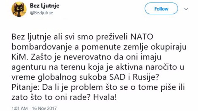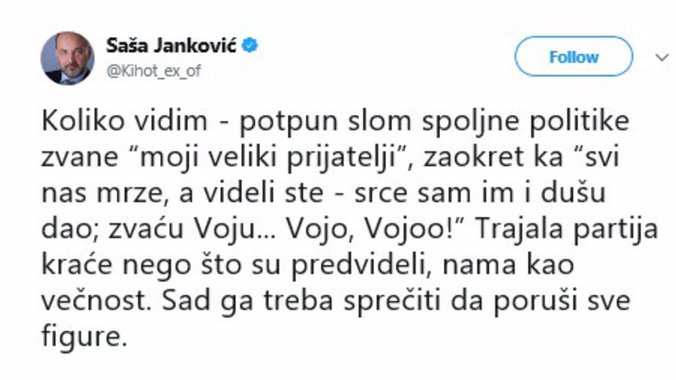 Samo nekoliko dana nakon što je stao u odbranu Bakira Izetbegovića, Janković je nastavio je na Tviteru da radi protiv Srbije.