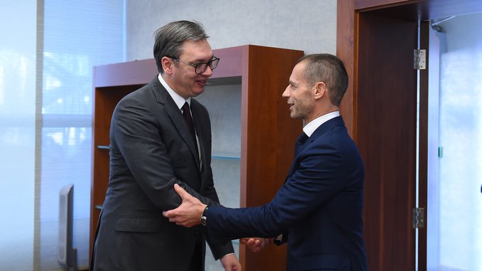 Predsednik Republike Srbije Aleksandar Vučić sastao se danas sa predsednikom UEFA Aleksandrom Čeferinom sa kojim je razgovarao o jačanju saradnje, zajedničkim aktivnostima u pogledu promocije najviših vrednosti za koje se zalaže evropska kuća fudbala, kao i o velikim projektima u koje naša zemlja ulaže u skladu sa najvišim standardima UEFA.
