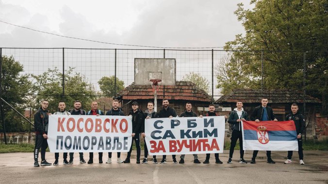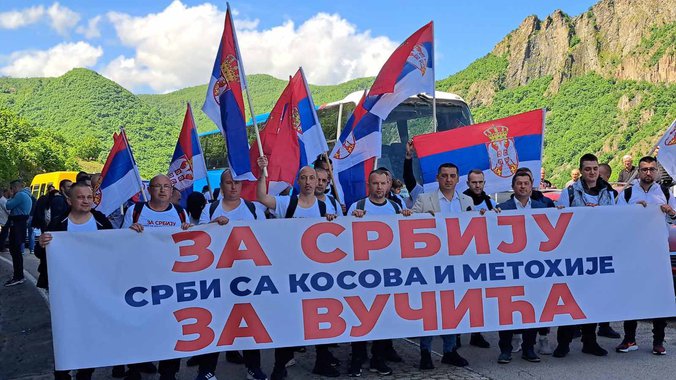 Srbi iz Severne Mitrovice i Leposavića nose zastave Srbije, odeveni su u majice na kojima piše "Za Srbiju, za Vučića, Srbi sa Kosova i Metohije" i nose transparent sa istim tekstom.