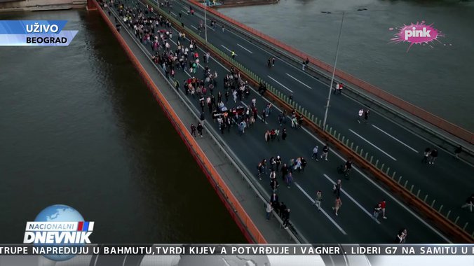 Organizatori nasilnih ‘protesta protiv nasilja’ odustali su od ranije isplaniranog napada na RTV ‘Pink’ i večeras tokom svog skupa ponovo blokiraju autoput na mostu ‘Gazela’ u Beogradu.