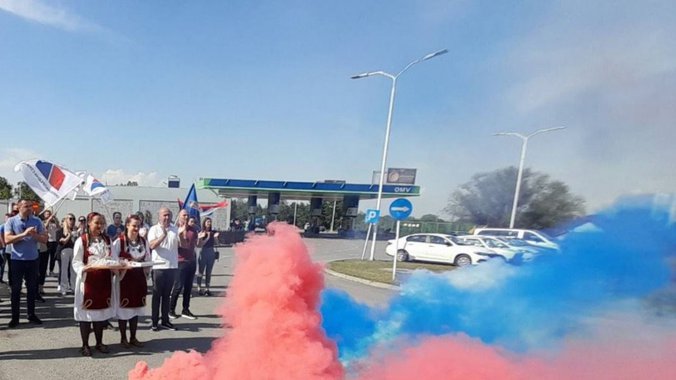 Oni su odeveni u majice na kojima piše "Za Srbiju, za Vučića, Srbi sa Kosova i Metohije" i nose transparent sa istim tekstom.