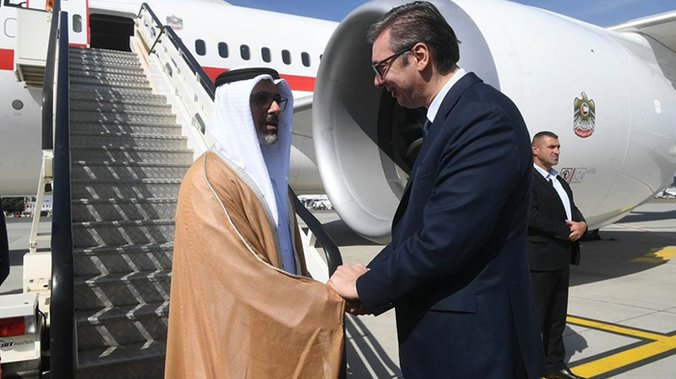 Vučić je princa prestolonaslednika Abu Dabija šeika Kaleda bin Mohameda bin Zajeda Al Nahjana dočekao na aerodromu „Nikola Tesla“ i poželeo mu dobrodošlicu u Beograd.
