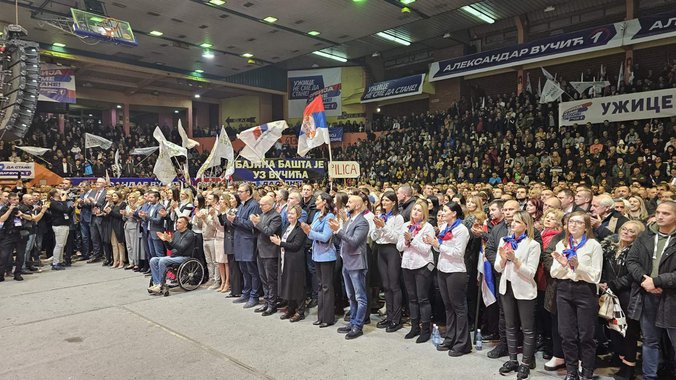 18:16 - Predsednik Srbije Aleksandar Vučić i predsednik SNS Miloš Vučević stigli su u prepunu halu, kojom se začuo gromoglasan aplauz i "Aco Srbine".