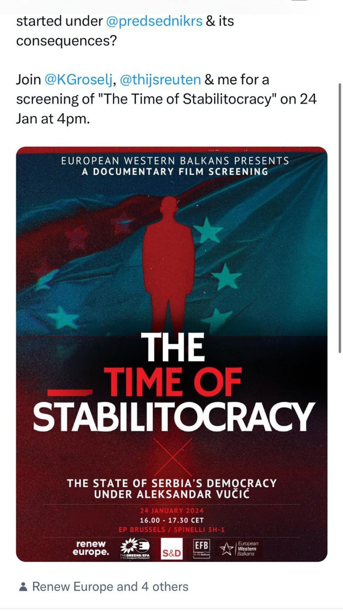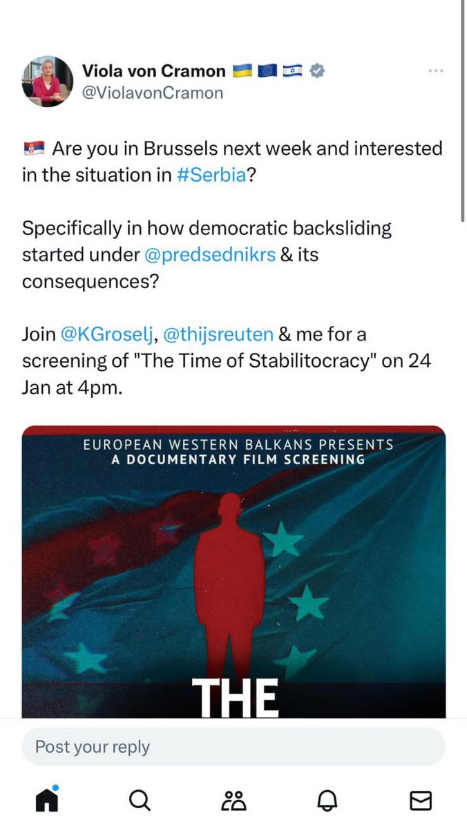 Poslanica EU i stalni izvestilac za tzv. "Kosovo" Viola fon Kramon objavila je na Tviteru plakat za film pod nazivom "Vreme stabilokratije - srpska demokratija pod Aleksandrom Vučićem".