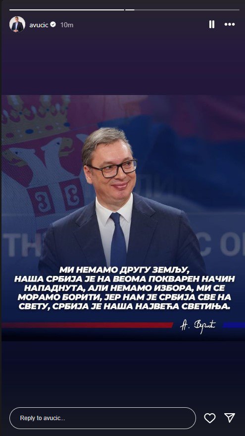 - Mi nemamo drugu zemlju, naša Srbija je na veoma pokvaren način napadnuta, ali nemamo izbora, mi se moramo boriti, jer nam je Srbija sve na svetu, Srbija je naša najveća svetinja - stoji u objavi predsednika Vučića.