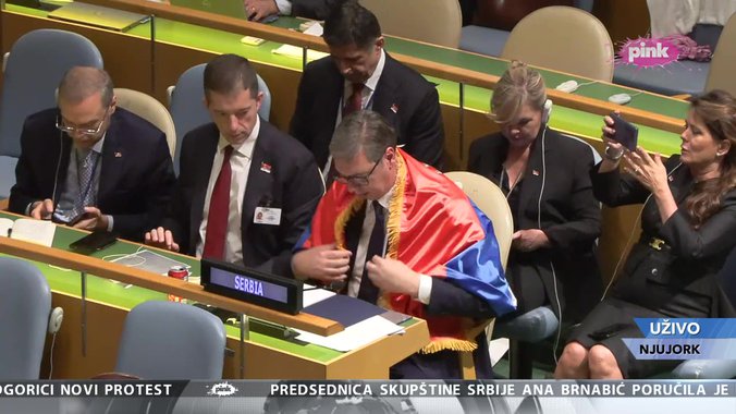 Predsednik Srbije Aleksandar Vučić nakon rezultata glasanja o sramnoj rezoluciji o Srebrenici ponosito je ogrnuo sprski zastavu u Ujedinjenim nacijama.