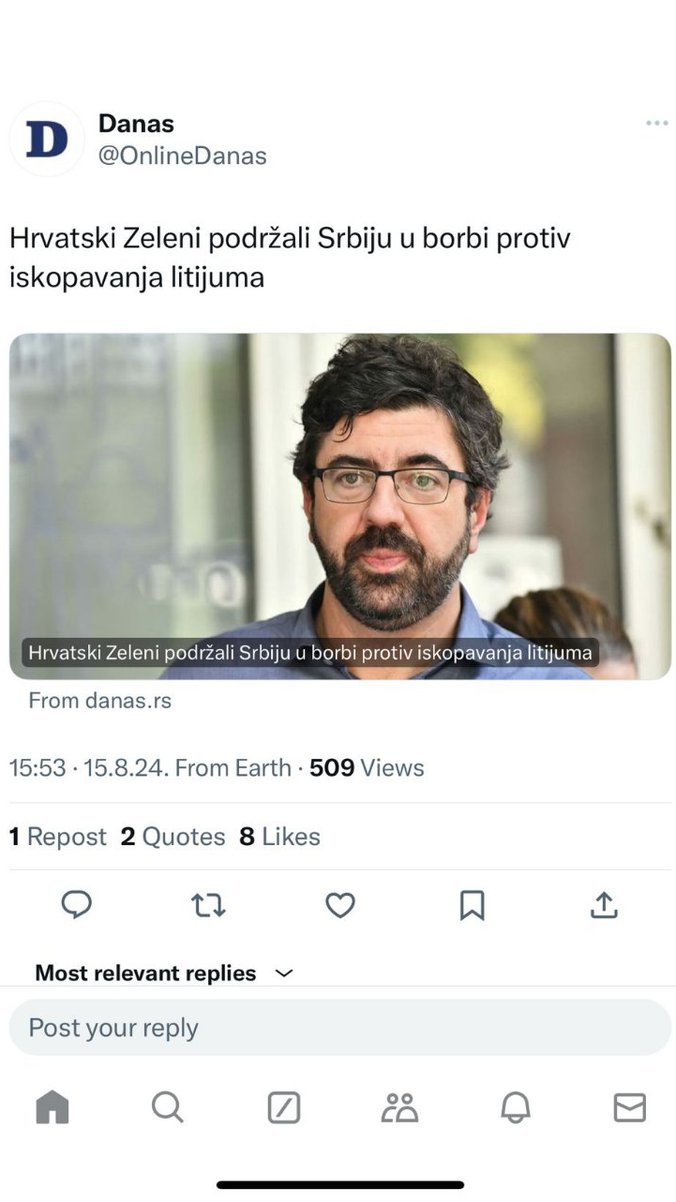 - Hrvatski Zeleni podržali Srbiju u borbi protiv iskopavanja litijuma - stoji na opozicionom portalu "Danasa".