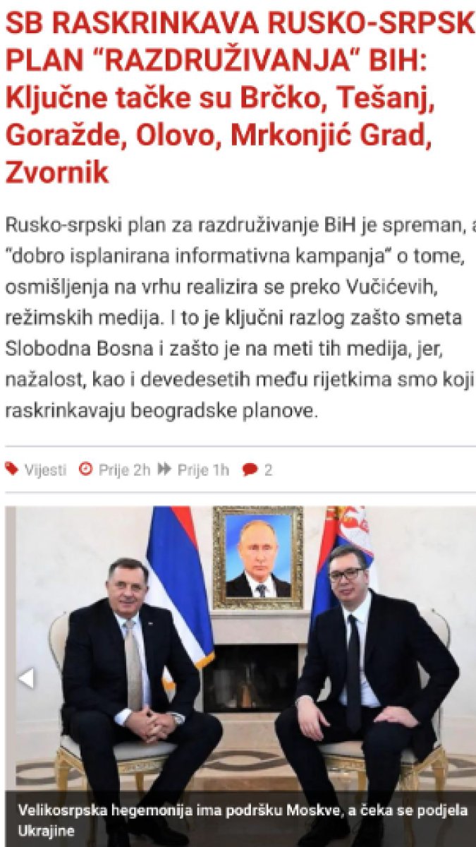 Kako se dalje navodi, upravo brojni od tih tekstova i analiza (proizvedeni i objavljeni u ruskim medijima na srpskom jeziku) korištenjem “argumenata“, tvrdnji, teza i hipoteza i koji se navode u “Informaciji o potrebi pokretanja procedure regulisanja odnosa Republike Srpske i Federacije BiH u skladu sa Dejtonskim sporazumom i međunarodnim aktima“ potvrđuju da se radi o zajedničkom, dobro koordinisanom planu, osmišljenom na najvišem rusko-srpskom vrhu.