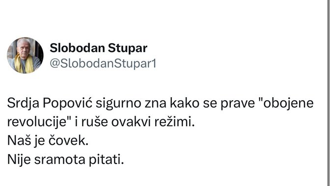 - Srđa Popović sigurno zna kako se prave "obojene revolucije" i ruše ovakvi režimi. Naš je čovek. Nije sramota pitati. - napisao je Stupar.