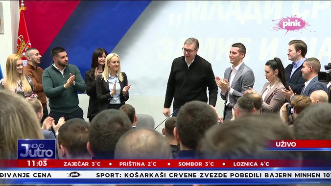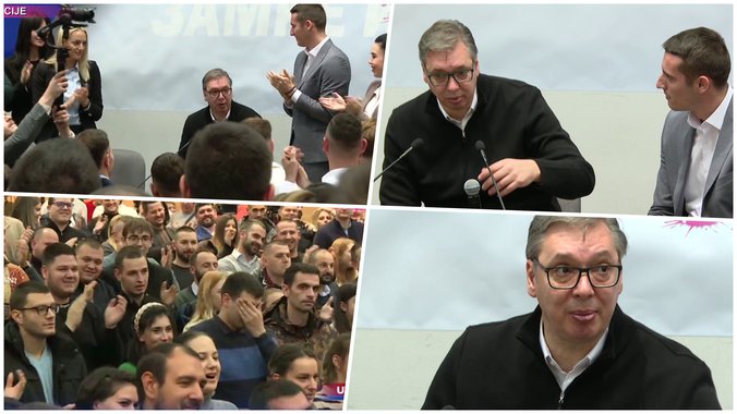 Kada je Vučić ušao u salu čulo se skandiranje: "Aco Srbine". Predsednik je kroz smeh poručio omladini da će izvesti svog dvojnika Dalibora Golubovića.
