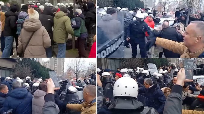 Kordon policajaca u punoj opremi stoji ispred SUP-a u Kraljevića Marka. Opozicionari su ponovo krenuli sa guranjem poicije, a među njima su se posebno istakle opozicionarke koje su kidisale na pripadnike policije kako bi upali u zgradu policijske uprave.