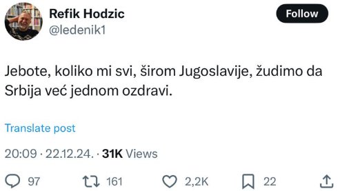 - Jebote, koliko mi svi, širom Jugoslavije, žudimo da Srbija već jednom ozdravi - naveo je Hodžić.