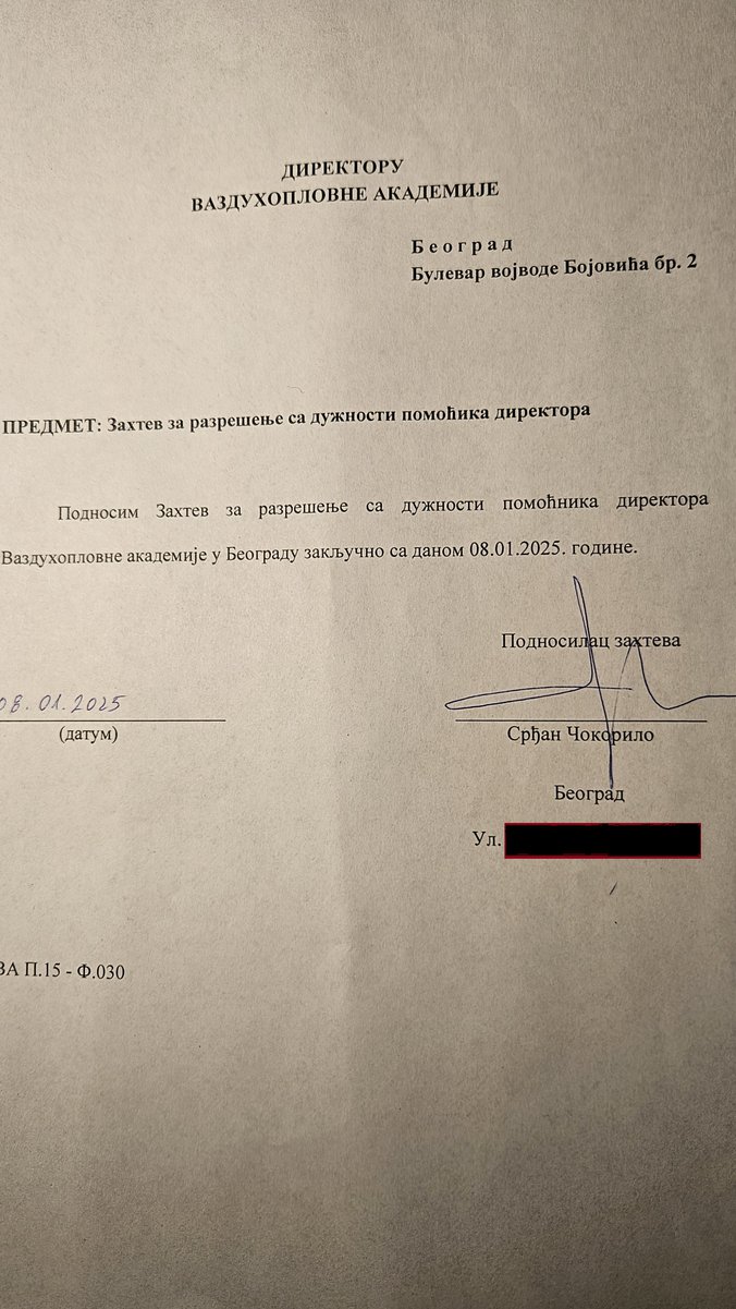 Ujedno, dostavljeni zahtev za razrešenjeje potpisan i nejasno je kako primerakpotpisnik nije zadržao za sebe. Samzahtev dat je dr Goranu Cvijoviću, kojije 08.01.2025. godine bio na funkcijidirektora.