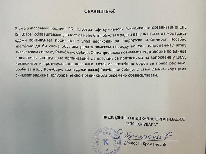 Sindikat radnika Kolubare obaveštavaće svoje radnike blagovremeno o daljim koracima, dodaje se u saopštenju.