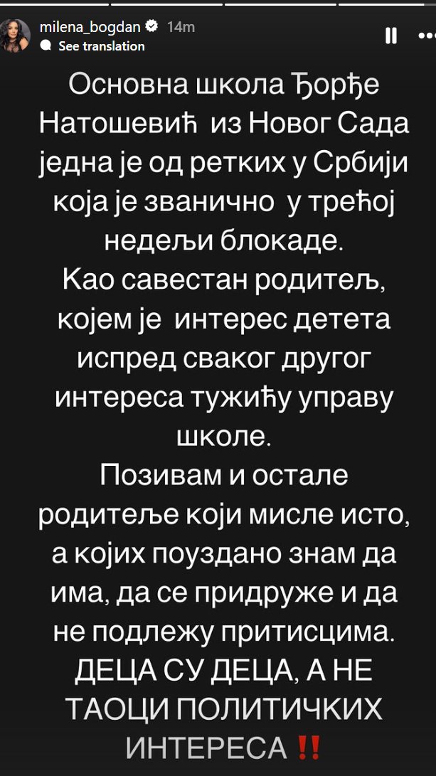 Državna sekretarka Milena Popović oglasila se povodom blokade škole u koju ide njen sin. Ona se na svom Instagram nalogu obratila i drugim roditeljima i pozvala ih da se ujedinje protiv pritisaka koji su im nametnuti.