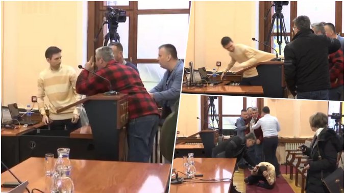 Na snimku se jasno vidi kako snimatelj biva oboren na pod, uz očigledno nasilničko ponašanje prisutnih odbornika.
