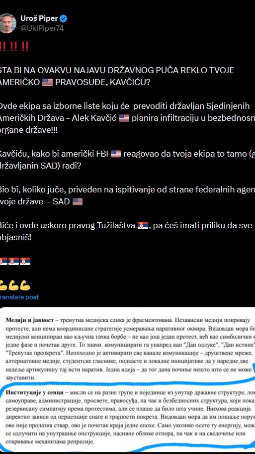 - Ovde ekipa sa izborne liste koju će prevoditi državljanin Sjedinjenih Američkih Država - Alek Kavčić planira infiltraciju u bezbednosne organe države! Kavčiću, kako bi američki FBI reagovao da tvoja ekipa to tamo (gde si državljanin SAD) radi? Bio bi, koliko juče, priveden na ispitivanje od strane federalnih agenata tvoje države - SAD. Biće i ovde uskoro pravog Tužilaštva , pa ćeš imati priliku da sve objasniš - naglasio je Piper.